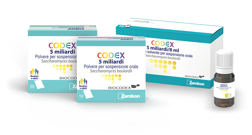 Nei casi di diarrea, anche accompagnata da dolore addominale o gonfiore, Codex svolge un’azione benefica per l’intestino, in quanto è indicato nella prevenzione e nel trattamento del dismicrobismo intestinale, ovvero un’alterazione nell’equilibrio del microbiota intestinale. Il principio attivo di Codex, il lievito Saccharomyces boulardii, svolge la sua attività:
